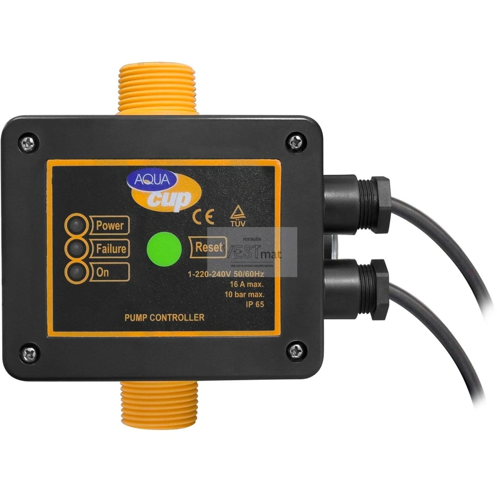 Hydrostat pro čerpadla do příkonu motoru 1,5 kW (16 A), s ochranou proti běhu nasucho, se zapínacím tlakem 1,5 bar. Provedení 230 V.