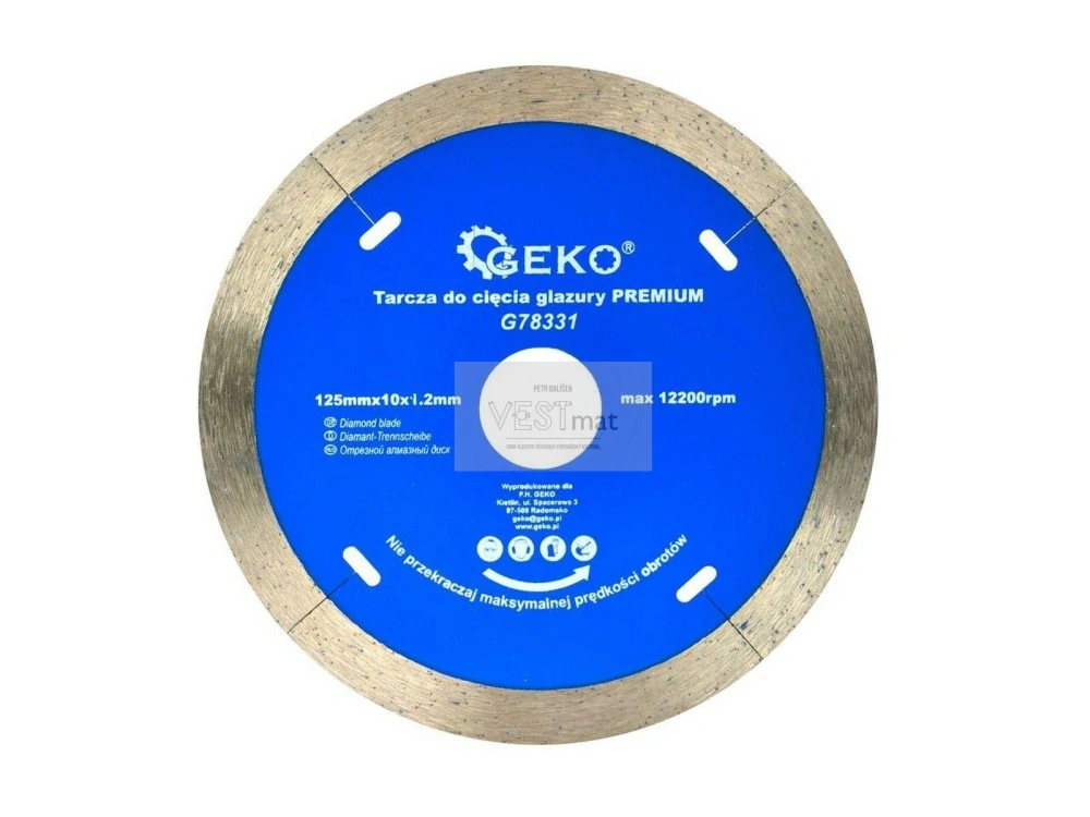 Precizní diamantový řezný kotouč GEKO s nepřerušeným diamantovým segmentem po celém obvodu. Tento kotouč je vhodný pro řezání tenkých tvrdých stavebních materiálů jako je např. keramika, glazované obklady nebo sklo a vytváří hladký a čistý řez bez otřepků. S celoobvodovým kotoučem je nutné řezat za mokra, aby nedošlo k přehřátí kotouče a jeho zvlnění.Technické parametry: