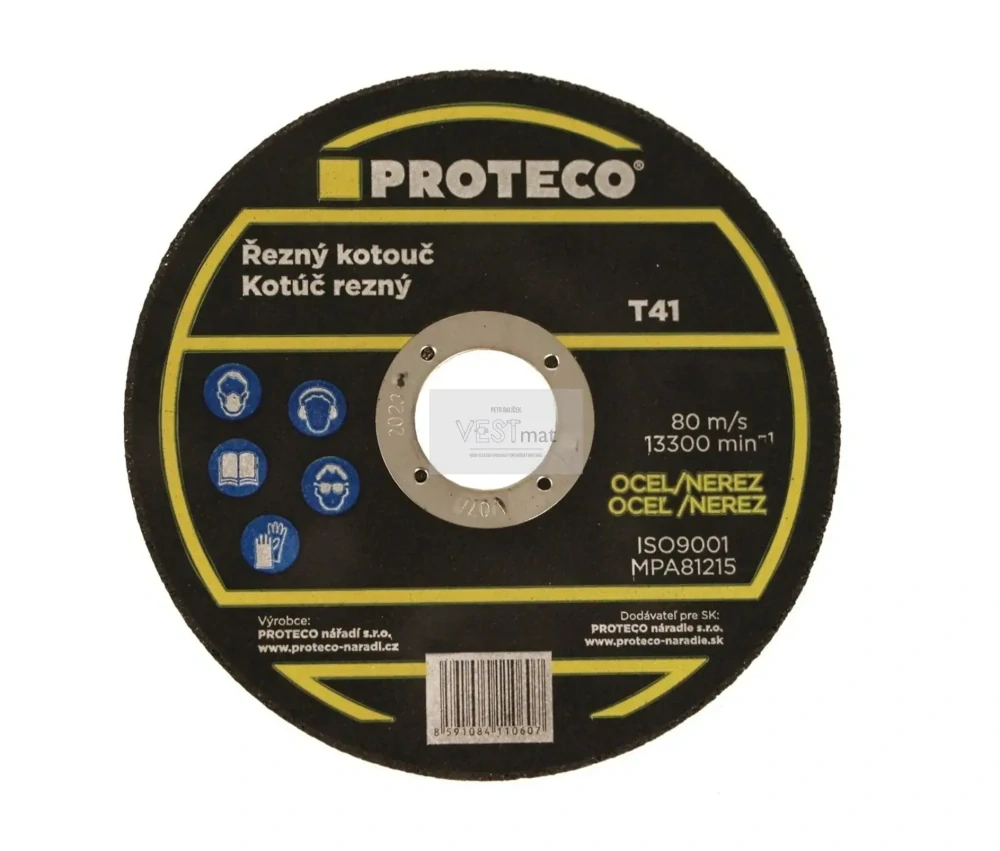 Řezný keramický kotouč PROTECO s průměrem 125 mm a tloušťkou 1,2 mm. Díky využití nejnovějších výrobních technologií dosahují tyto kotouče oproti běžným řezným kotoučům významně lepšího řezného výkonu (až 40% úspora času) při až dvojnásobně menším opotřebení.