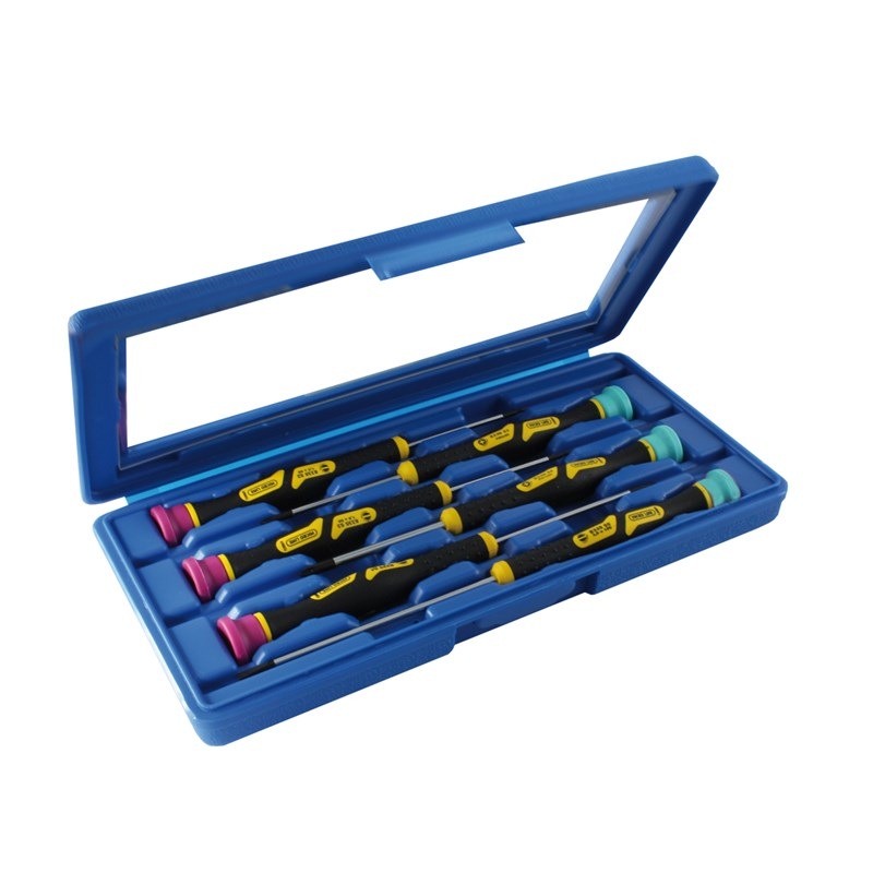 Sada šroubováků Narex MICRO LINE PROFI, 6-dílná obsahuje 6 mikro šroubováků uložených v praktickém plastovém kufru a je ideální pro precizní práci a opravy zařízení menších rozměrů (např. telefony, měřicí přístroje, fotoaparáty apod.).